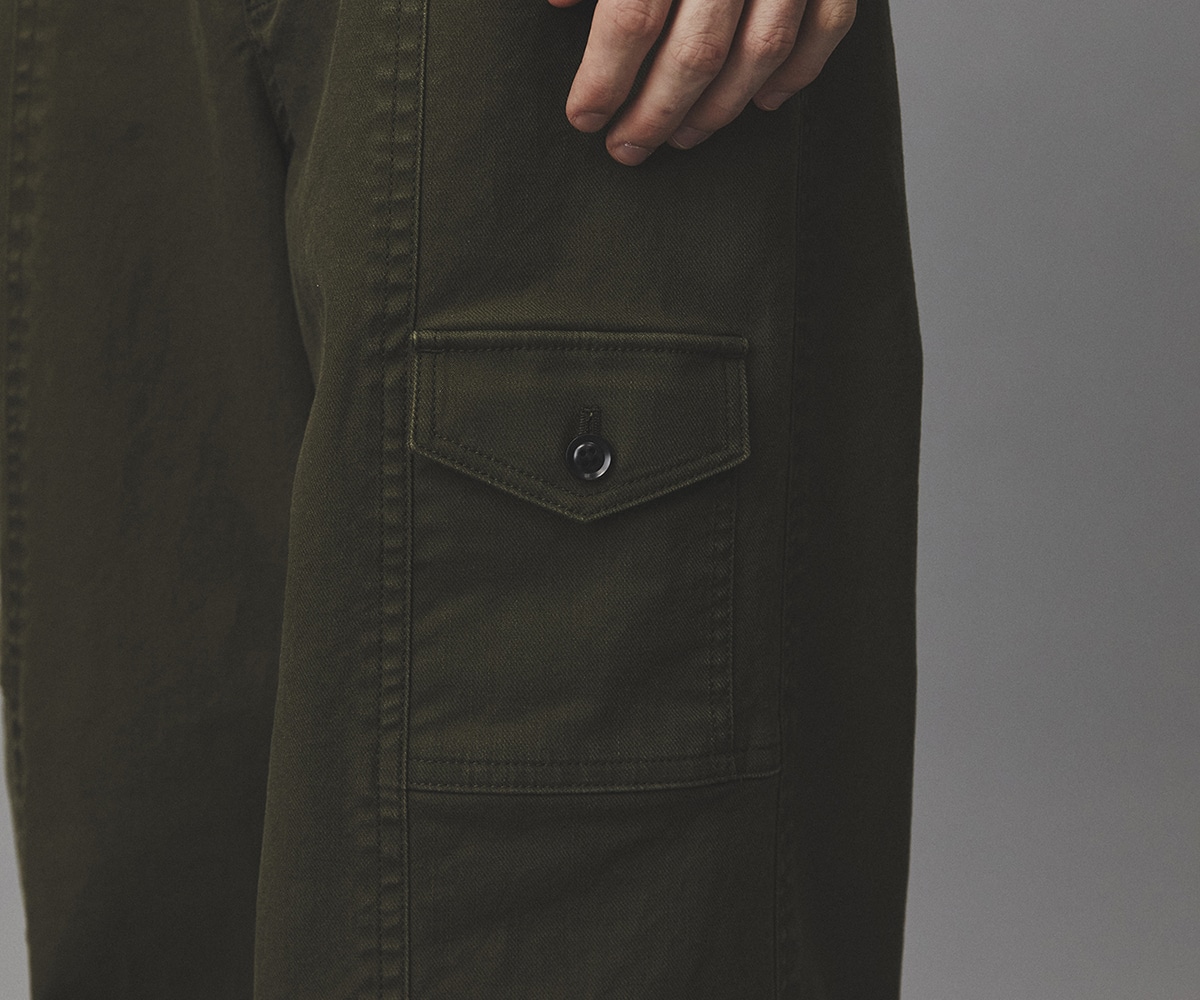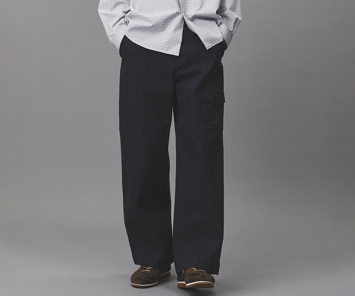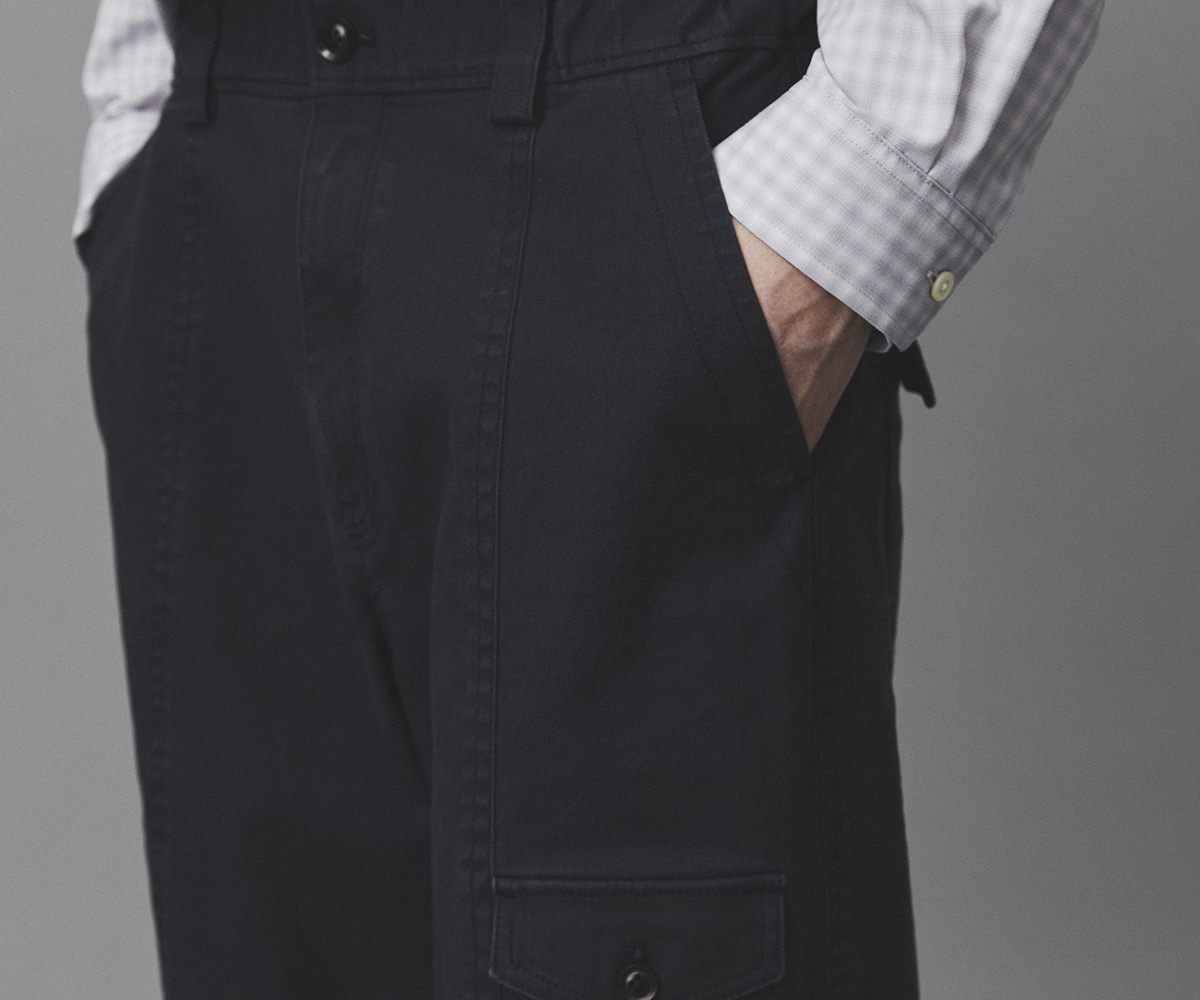 ミリタリーパンツの代表的なディテールであるベイカーパンツを、現代的なシルエットで再構築。