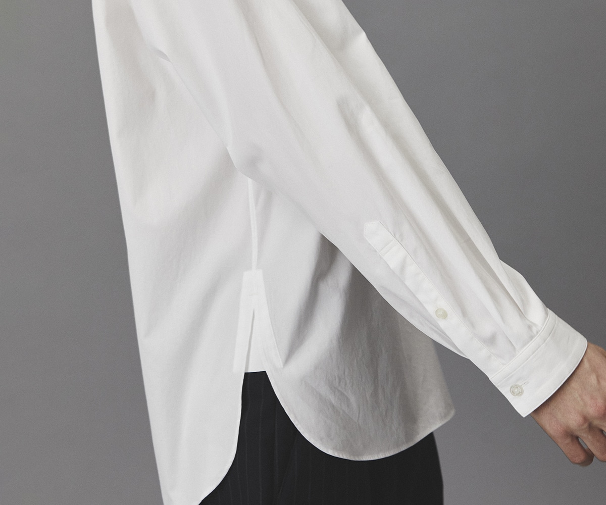 小さなパーツですが、こうした見えない部分まで丁寧に作ることで、長く着続けられるシャツに仕上がります。1枚でも羽織りにも。衿を閉めるとクリーンで合わせやすい印象に。