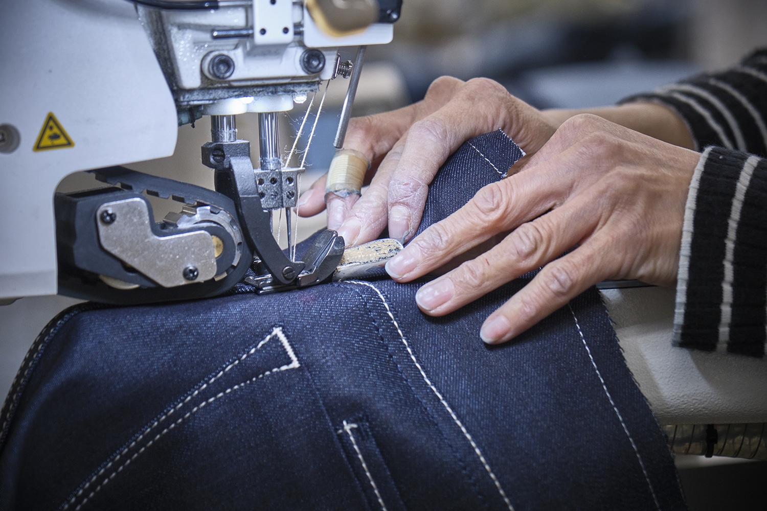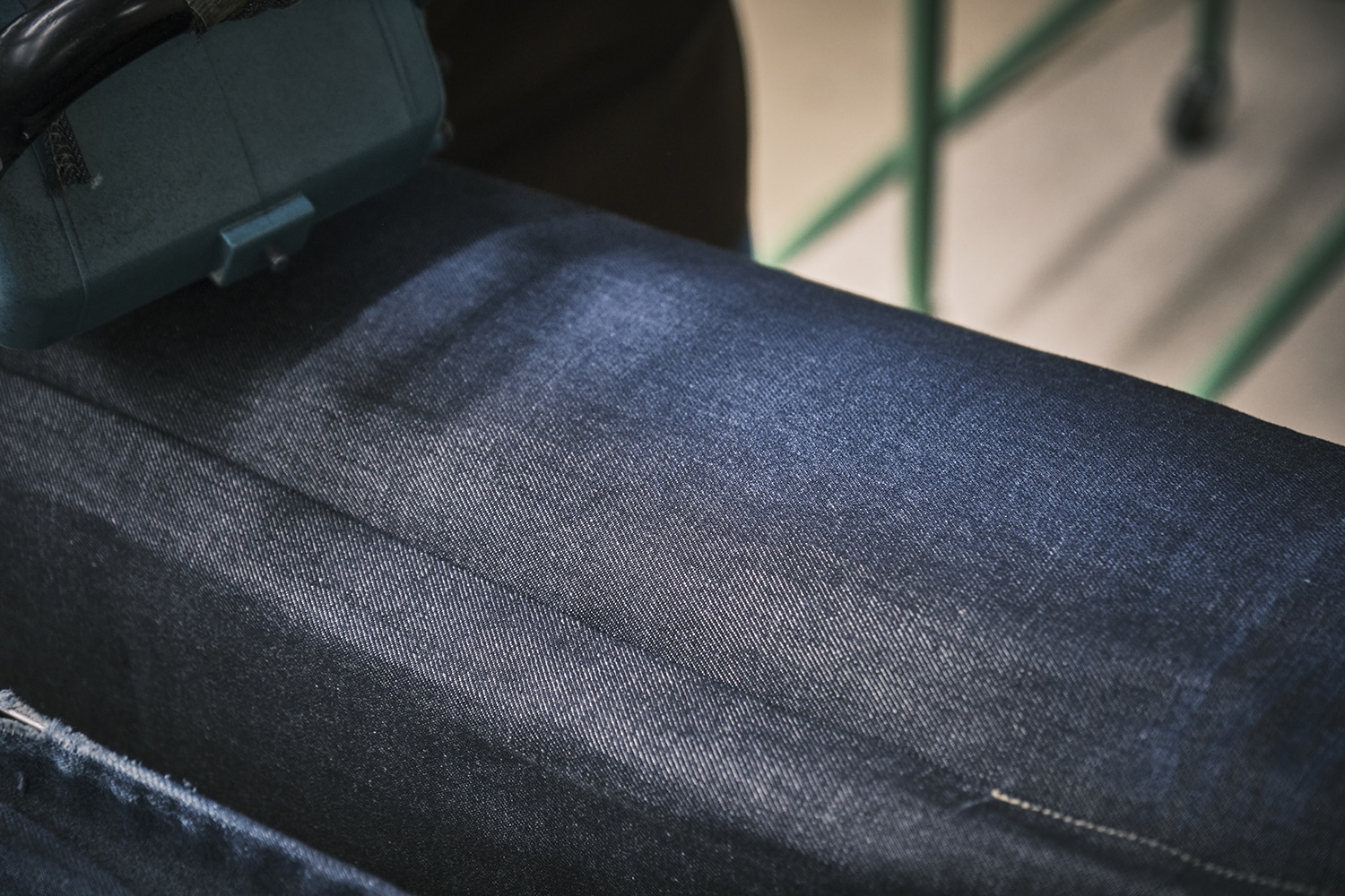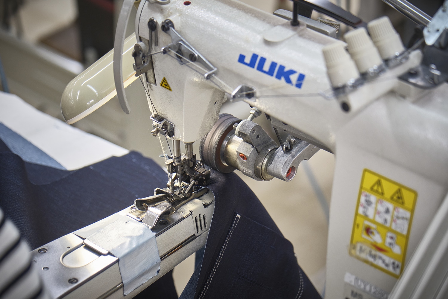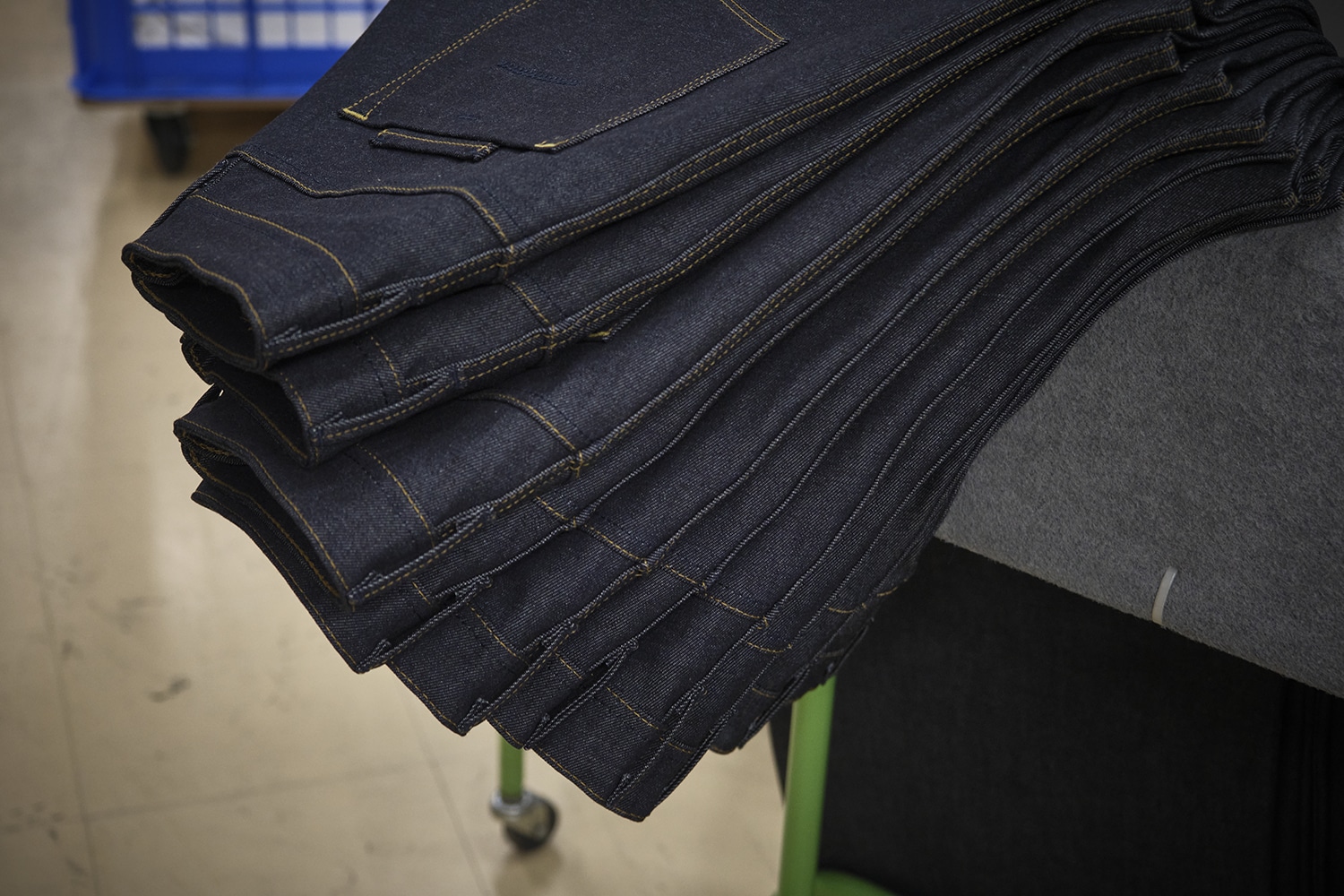 一本を一気に作るのではなく、熟練の職人が丁寧に一工程ずつ積み上げていくことで、製品としての説得力が形になっていくのです。 各パーツは組み合わされ、ばらばらだった布が、ようやく一本のデニムとして輪郭を持ち始めます。 見た目の美しさだけでなく、穿いたときの落ち方や動きやすさまで、この組み立ての精度に大きく左右されます。