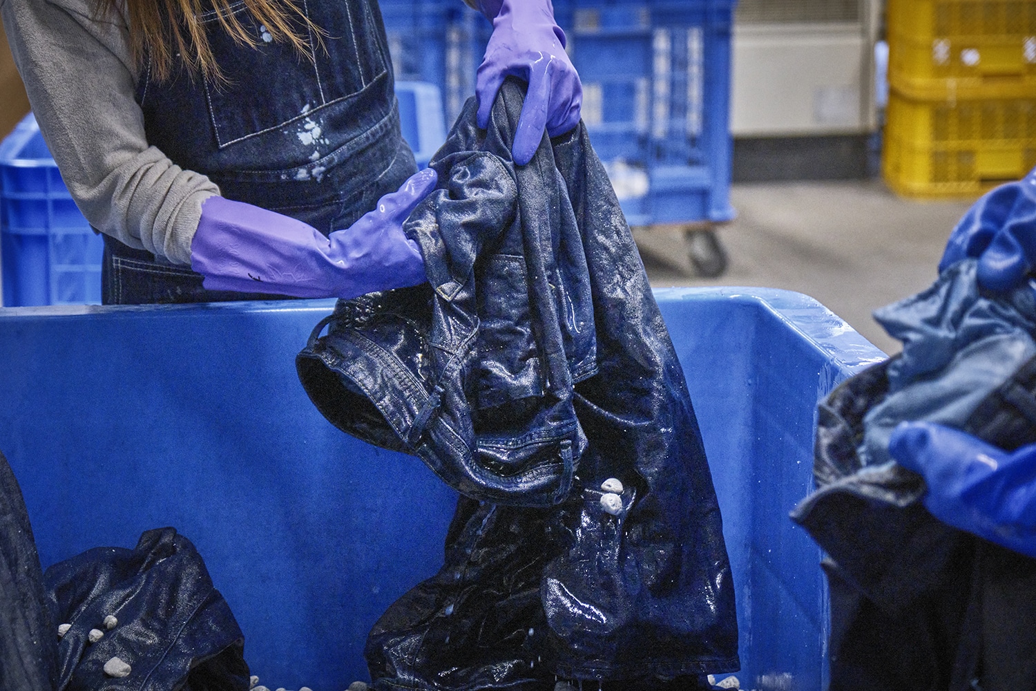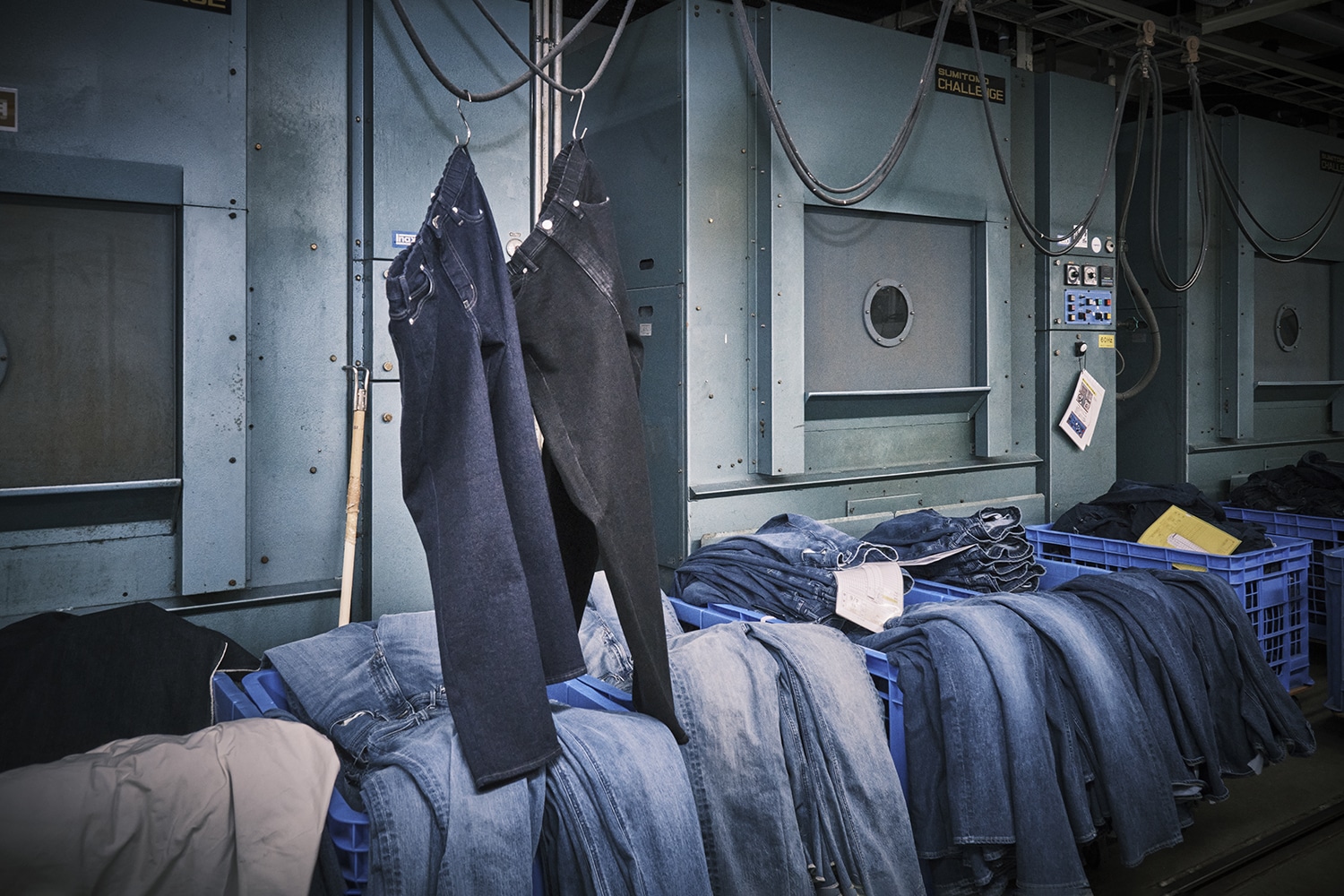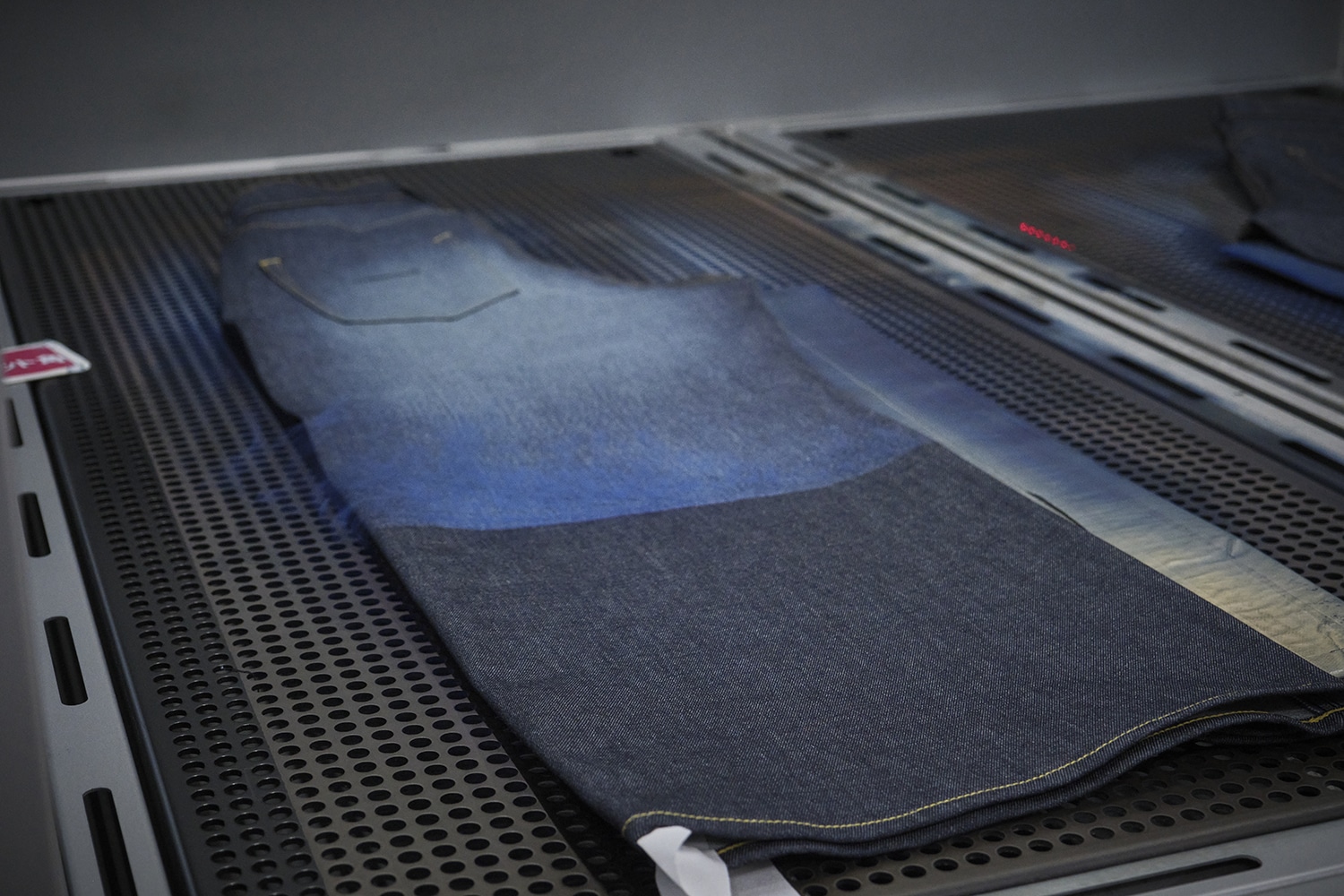 縫い上がった直後のデニムは、まだ素の状態。 そこから洗い、染め、乾燥といった工程を重ねることで、色落ちや濃淡、奥行きのある表情を引き出していきます。 多様な表情を生み出せるのは、この工程があるからこそです。