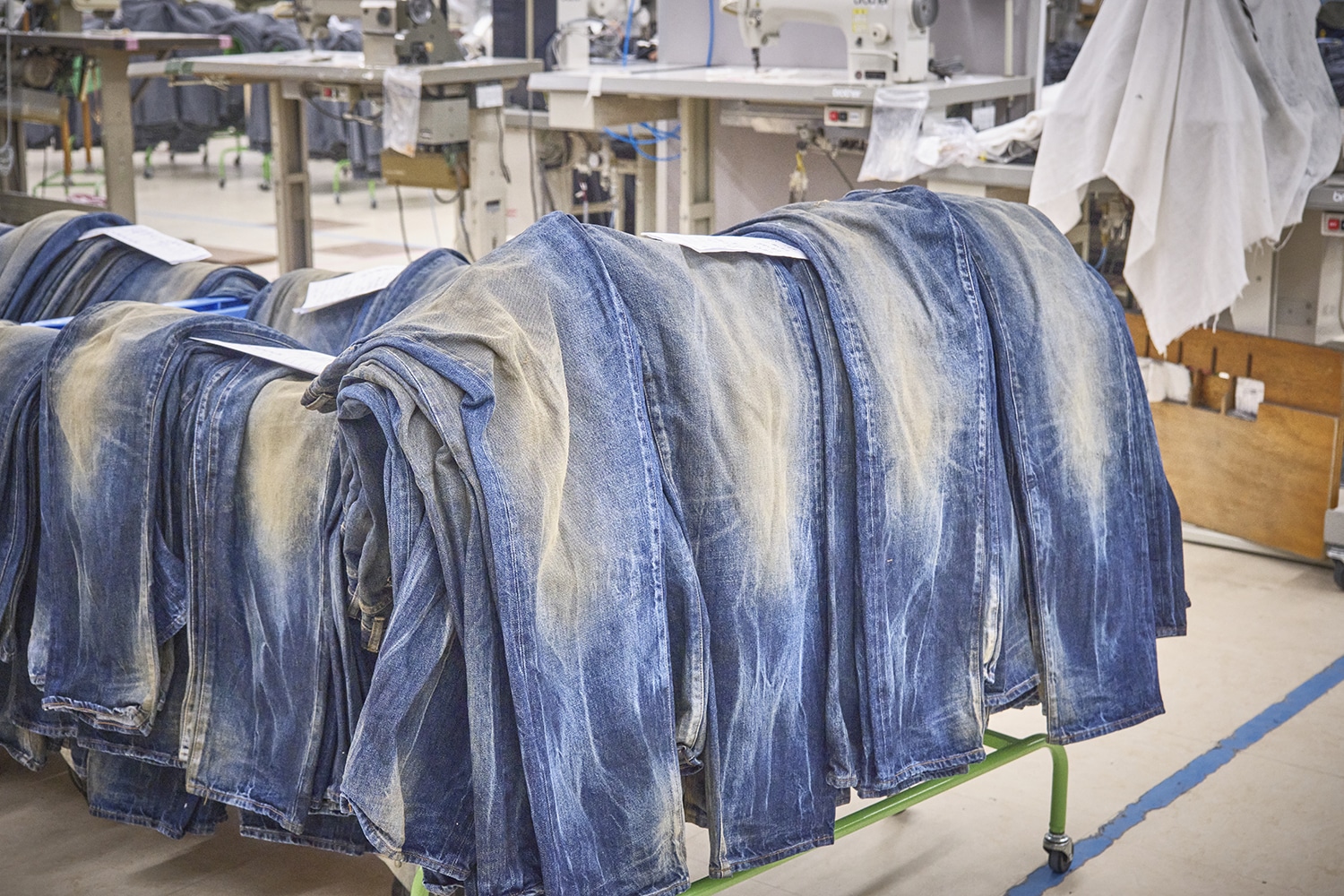 裁断、縫製、洗い加工、仕上げ。