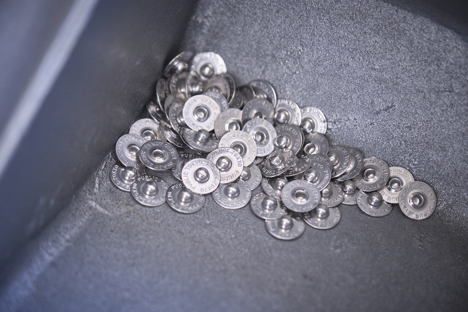 最終工程では、レザーパッチ、ボタン、リベットなどの副資材を取り付け、一本を製品として完成へ近づけていきます。もちろん、PUBLIC TOKYOオリジナル。 ここは単なる付属の取り付けではなく、全体の完成感を引き締める大切な工程です。 細部までこだわっているかどうかで、ジーンズ全体の説得力が大きく変わるのです。