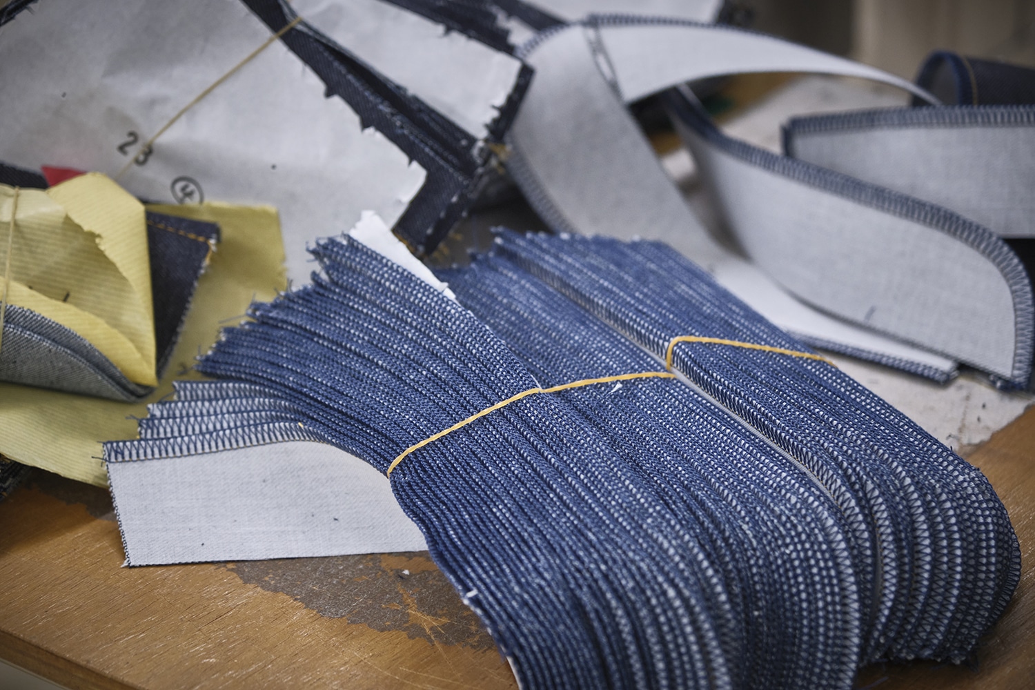 まず行うのは裁断です。生地を正確に切り出し、その後はモデルごとにパーツを振り分けていきます。 同じように見える生地が並ぶからこそ、この最初の整理がその後の工程の精度を支えます。 一本の完成度は、最初の段取りからすでに始まっているのです。