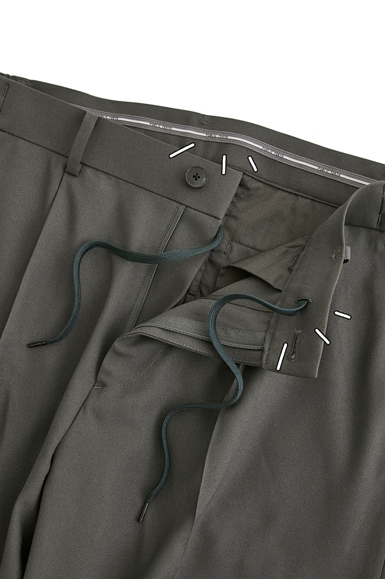 アウトドア製品でも使われている"GRAPHENE"を使用。調温機能を持つ素材です。上がりすぎた温度を下げ、下がっている温度を上げる機能があるため、室内外の移動をしても快適。更に防臭、抗菌性も搭載。「スラックスにこれが欲しい」が詰まった一着です。